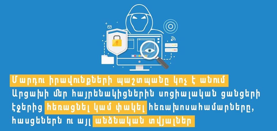 Արցախի մեր հայրենակիցներուն կոչ կ'ընեմ ընկերային ցանցերու էջերէն հեռացնելու կամ փակելու հեռախօսահամարները, հասցէներն ու այլ անձնական տուեալները. ՀՀ ՄԻՊ-ը կ'ահազանգէ